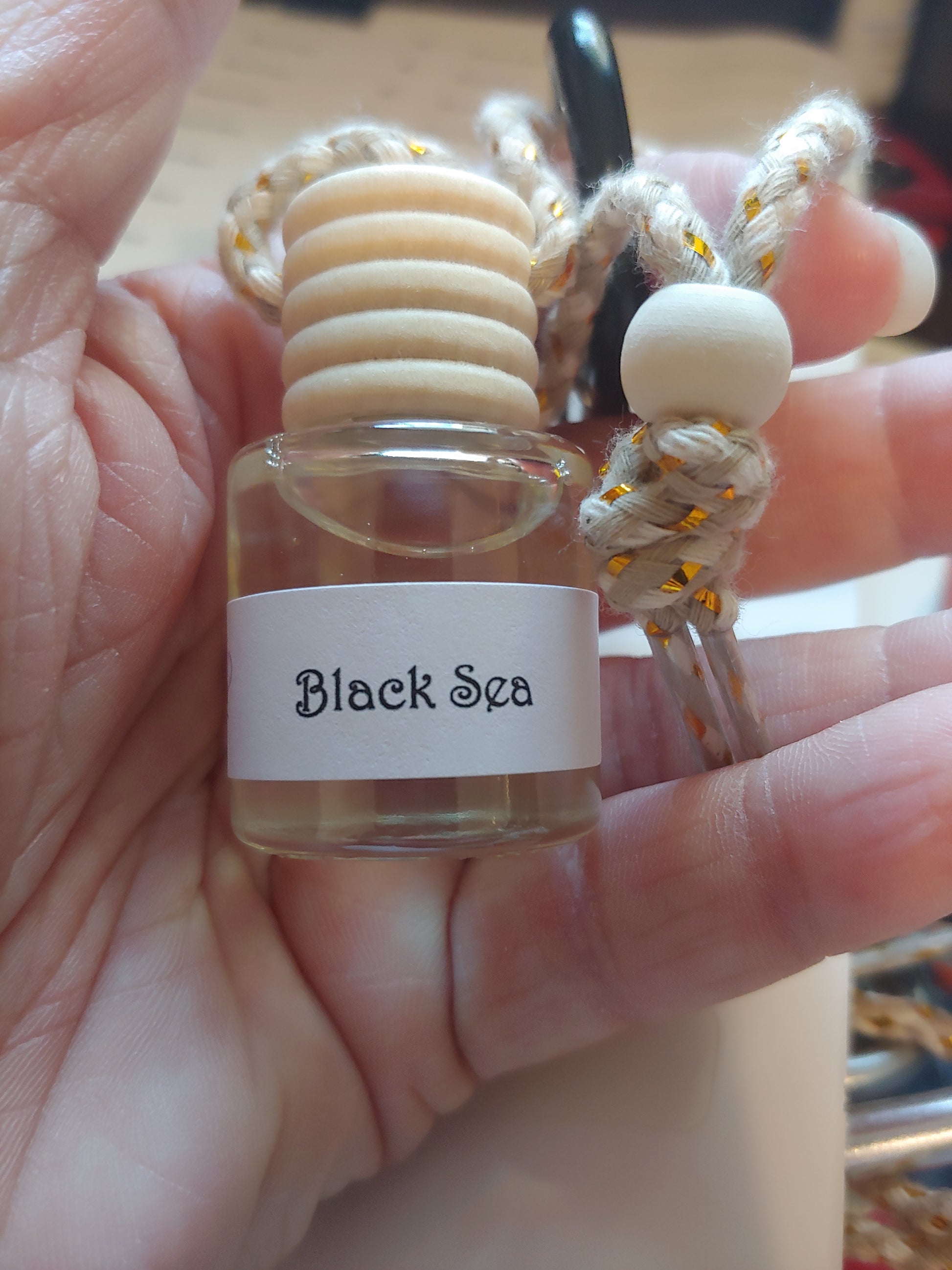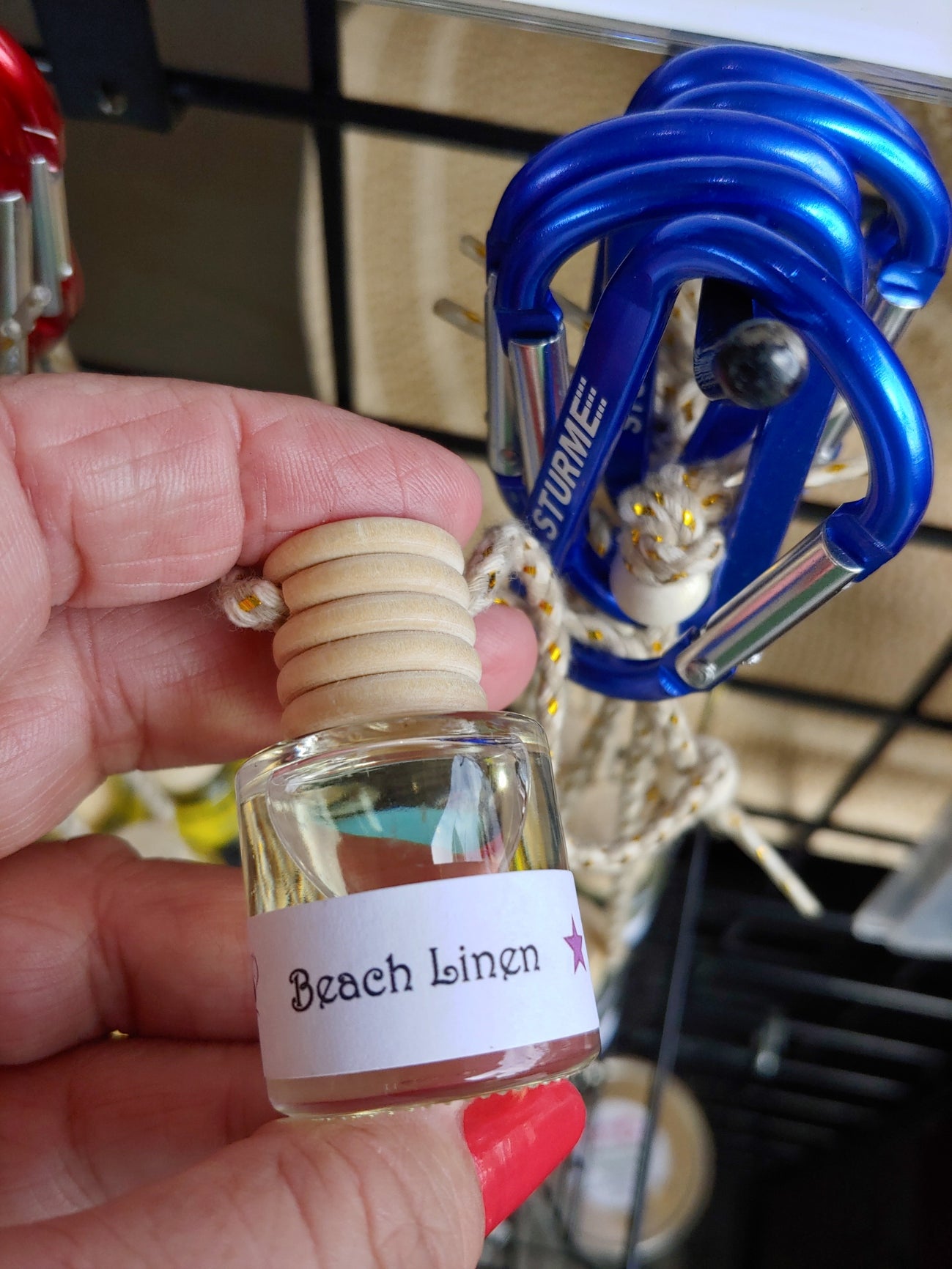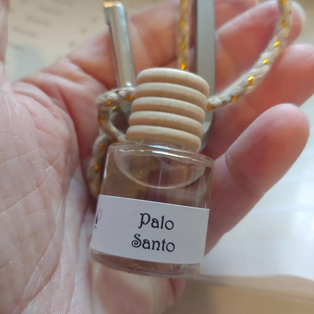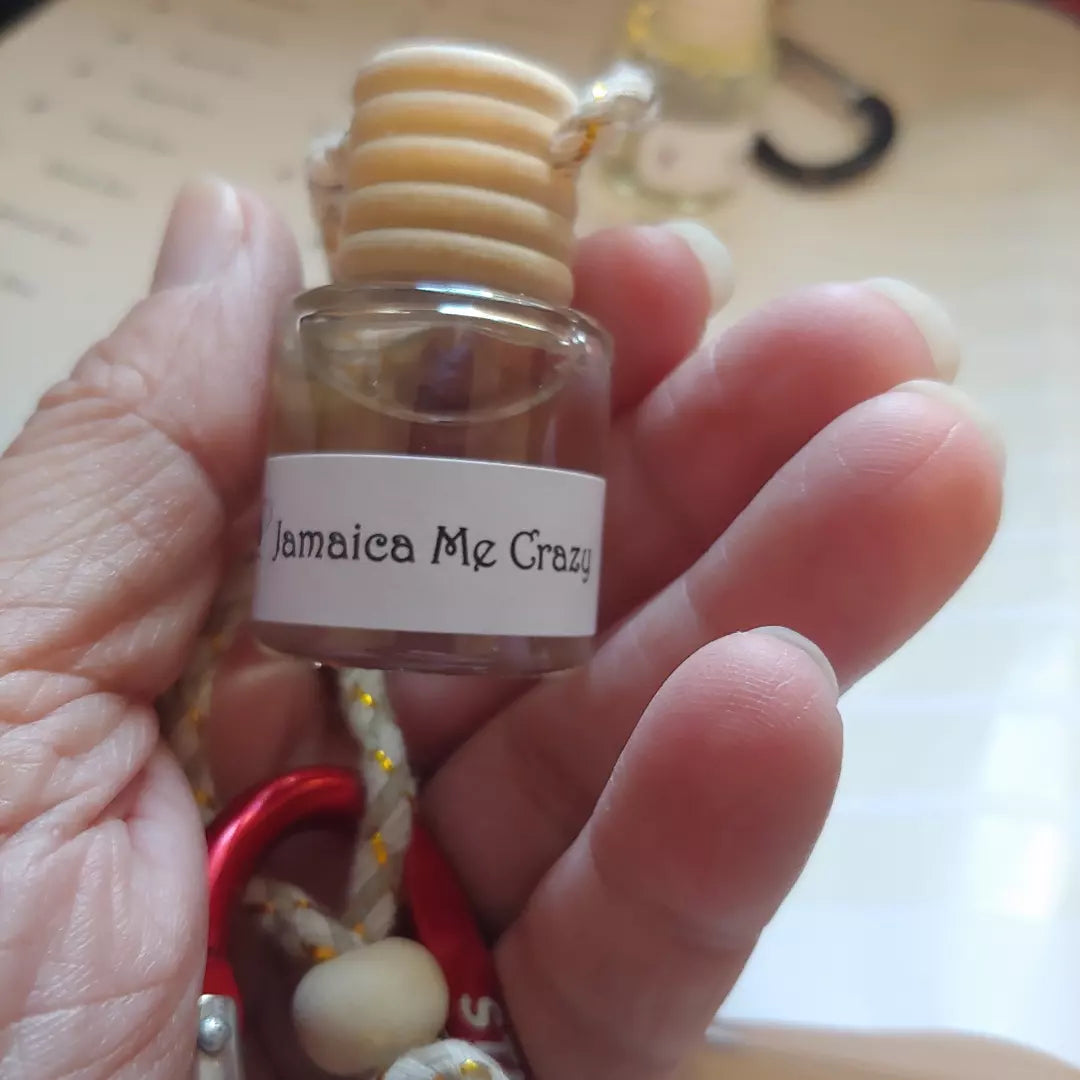These glass bottles are perfect for cars. Each bottle contains around 5 to 6 ml of fragrance oil. Topped with a wood cap drilled with tiny holes, the oil is wicked up into the wood and the string.